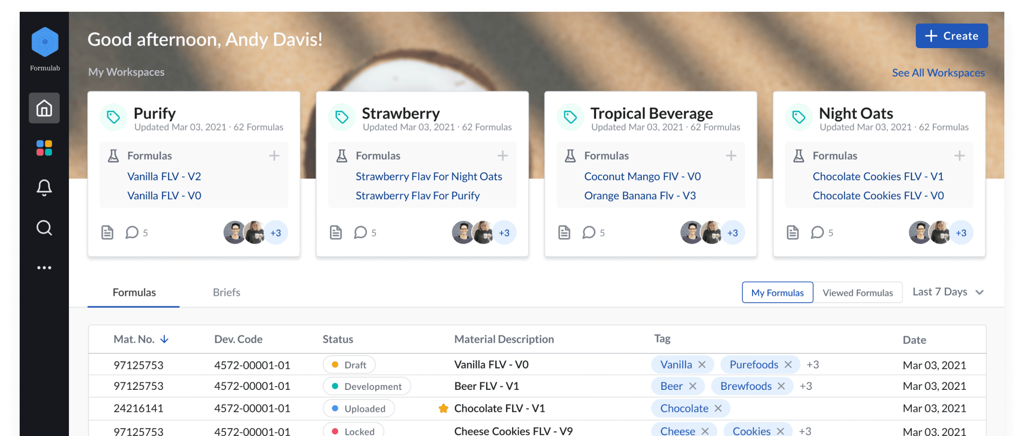 The dashboard brings all creation-related tasks into one place, making it easy to see requirements, find formulas, and access working files. Workspace folders and pinned items help users quickly get organized and start creating.